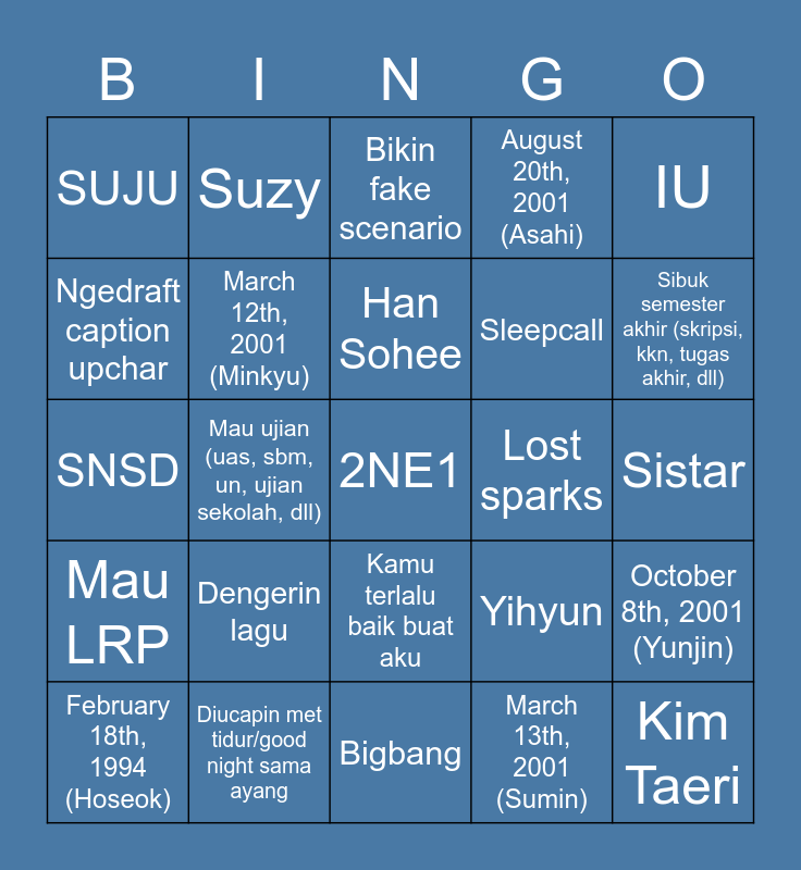 This bingo card has 25 words: Mau LRP, Diucapin met tidur/good night sama ayang, 2NE1, March 13th, 2001 (Sumin), IU, SUJU, Suzy, Bikin fake scenario, Lost sparks, October 8th, 2001 (Yunjin), Ngedraft caption upchar, March 12th, 2001 (Minkyu), Bigbang, Yihyun, Sibuk semester akhir (skripsi, kkn, tugas akhir, dll), February 18th, 1994 (Hoseok), Mau ujian (uas, sbm, un, ujian sekolah, dll), Han Sohee, Sleepcall, Sistar, SNSD, Dengerin lagu, Kamu terlalu baik buat aku, August 20th, 2001 (Asahi) and Kim Taeri.