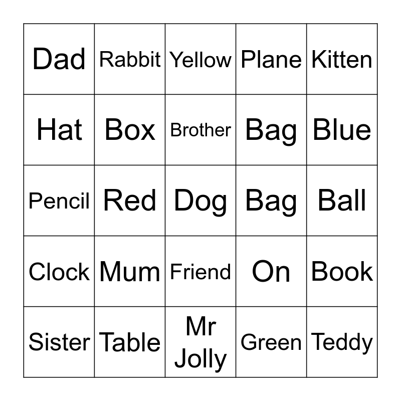 This bingo card has 25 words: Mum, Mr Jolly, Brother, Sister, Kitten, Dad, Hat, Rabbit, Bag, Friend, Bag, Pencil, On, Book, Box, Teddy, Ball, Yellow, Blue, Red, Dog, Table, Clock, Plane and Green.