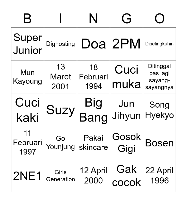 This bingo card has a free space and 24 words: Go Younjung, Girls Generation, 18 Februari 1994, 2NE1, Diselingkuhin, Super Junior, Mun Kayoung, Dighosting, Jun Jihyun, Pakai skincare, Cuci muka, Cuci kaki, Gosok Gigi, Bosen, 13 Maret 2001, Gak cocok, Song Hyekyo, Doa, Ditinggal pas lagi sayang-sayangnya, Suzy, 22 April 1996, 11 Februari 1997, 2PM and 12 April 2000.