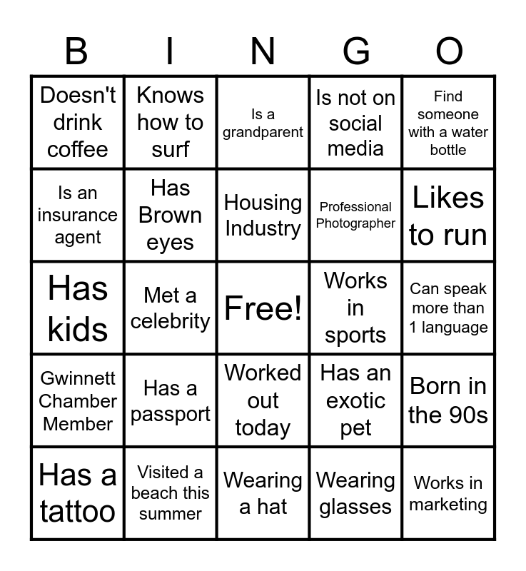 This bingo card has a free space and 24 words: Has a passport, Visited a beach this summer, Housing Industry, Has a tattoo, Find someone with a water bottle, Doesn't drink coffee, Is an insurance agent, Knows how to surf, Works in sports, Worked out today, Professional Photographer, Has kids, Has an exotic pet, Born in the 90s, Has Brown eyes, Wearing glasses, Can speak more than 1 language, Is a grandparent, Likes to run, Met a celebrity, Works in marketing, Gwinnett Chamber Member, Is not on social media and Wearing a hat.