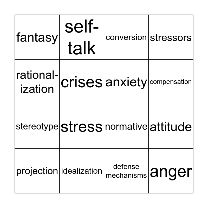 This bingo card has 20 words: attitude, displace-ment, conversion, regression, projection, rational-ization, idealization, fantasy, stereotype, self-talk, stress, normative, crises, anger, anxiety, depression, compensation, stressors, defense mechanisms and direct attack.