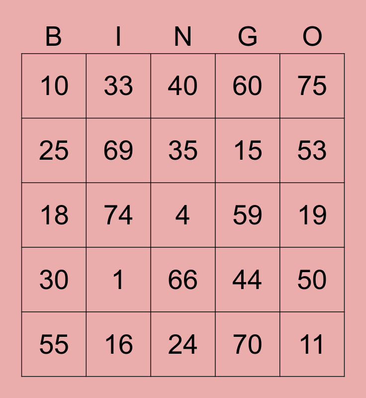This bingo card has 25 words: 1, 24, 35, 55, 75, 10, 25, 33, 59, 66, 15, 18, 44, 50, 69, 11, 19, 40, 53, 74, 4, 16, 30, 60 and 70.