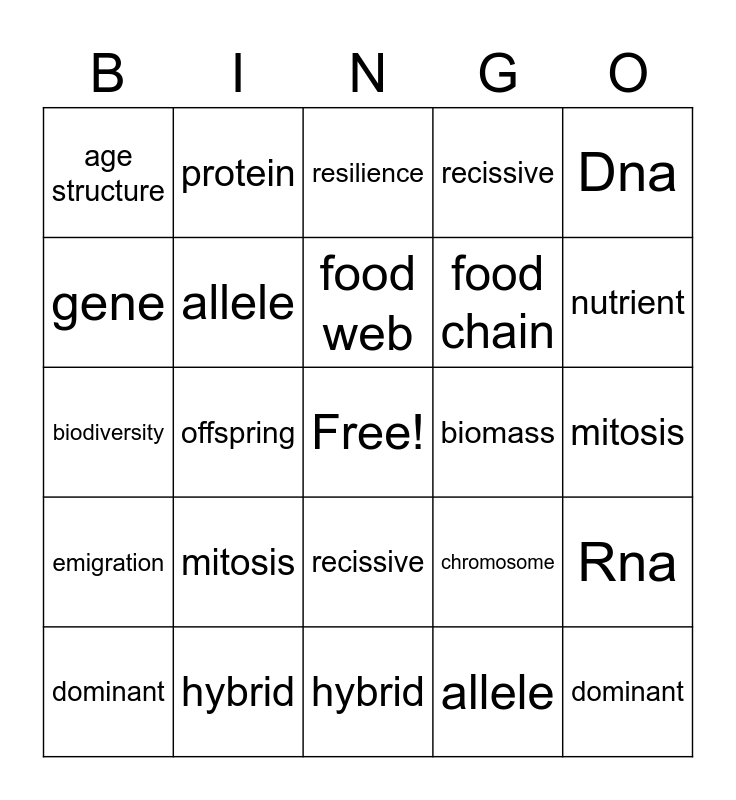 This bingo card has a free space and 49 words: Dna, dominant, heredity, hybrid, mitosis, offspring, protein, population, gene, nucleus, allele, recissive, Rna, chromosome, age structure, keystone, food web, biomass, biosphere, Dna, offspring, allele, age structure, food chain, trophic level, nutrient, dominant, protein, recissive, emigration, hereidty, free, population, food web, hybrid, Rna, gene, biomass, mitosis, nucleus, chromosome, biosphere, limiting factor, mutualism, biodiversity, resilience, conservation biology, paratism and niche.