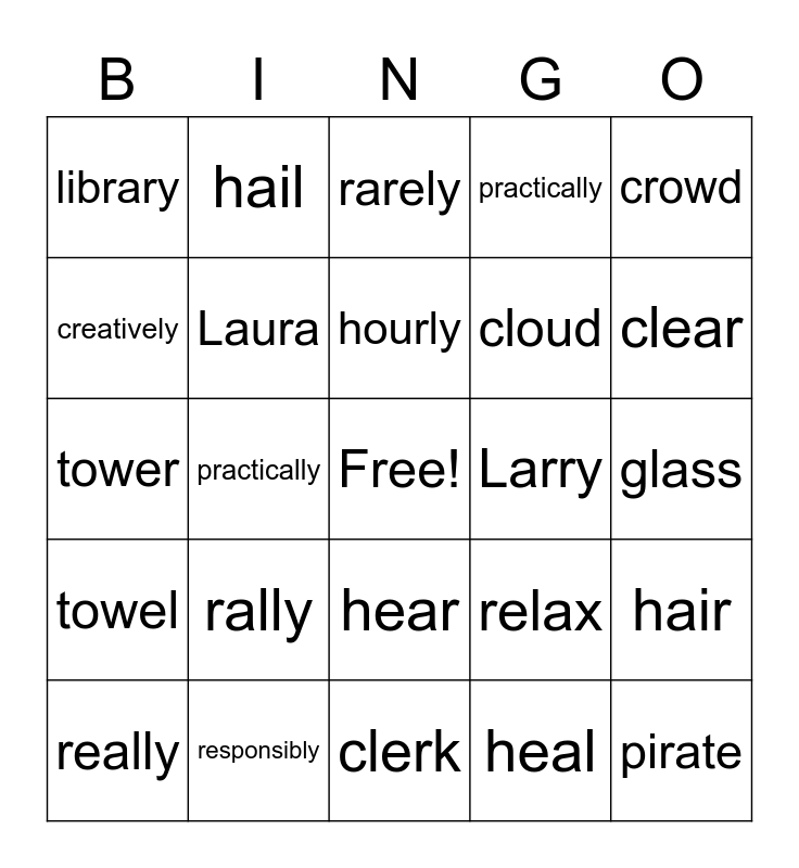 This bingo card has a free space and 29 words: really, friendly, practically, bright, library, rarely, Laura, rally, Larry, responsibly, glass, pirate, clerk, heal, clear, grass, hear, towel, crowd, tower, relax, Rachel, cloud, creatively, practically, hail, hair, hourly and howling.