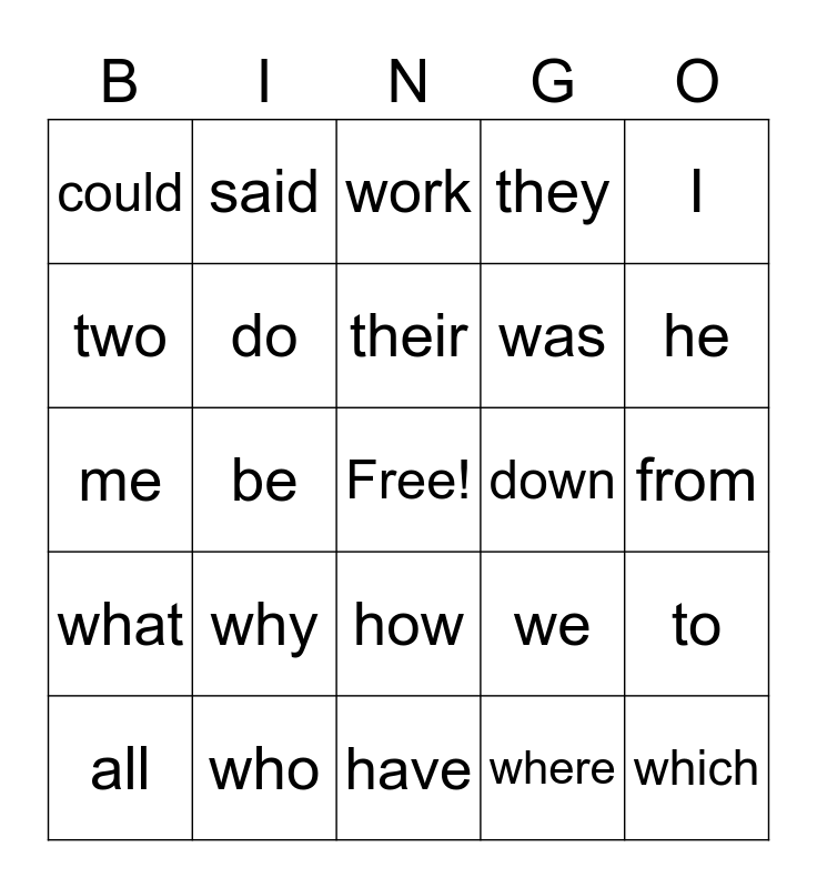 This bingo card has a free space and 29 words: all, your, be, would, could, work, do, why, down, who, from, which, have, where, he, when, how, what, I, me, we, one, was, two, they, said, to, their and should.