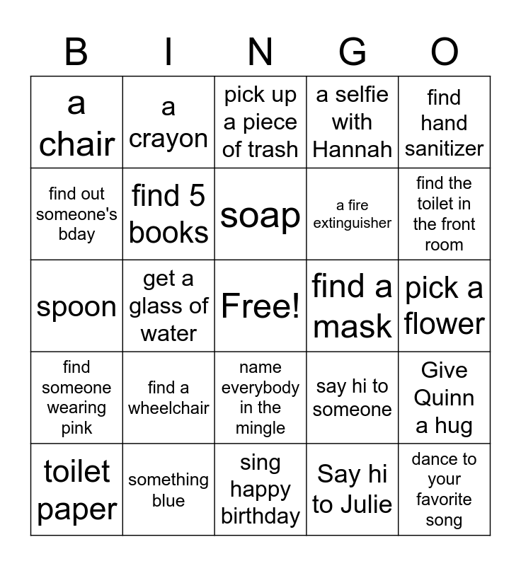 This bingo card has a free space and 24 words: find a wheelchair, something blue, soap, toilet paper, find hand sanitizer, a chair, find out someone's bday, a crayon, find a mask, name everybody in the mingle, a fire extinguisher, spoon, say hi to someone, Give Quinn a hug, find 5 books, Say hi to Julie, pick a flower, pick up a piece of trash, find the toilet in the front room, get a glass of water, dance to your favorite song, find someone wearing pink, a selfie with Hannah and sing happy birthday.