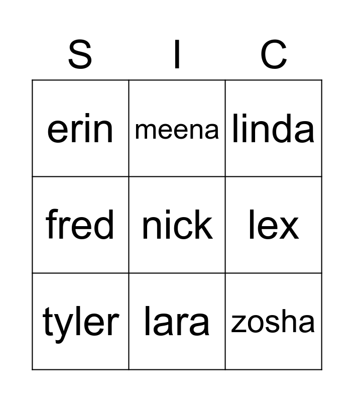 This bingo card has a free space and 10 words: lara, linda, erin, zosha, fred, tyler, meena, bobby bruce, lex and danny.