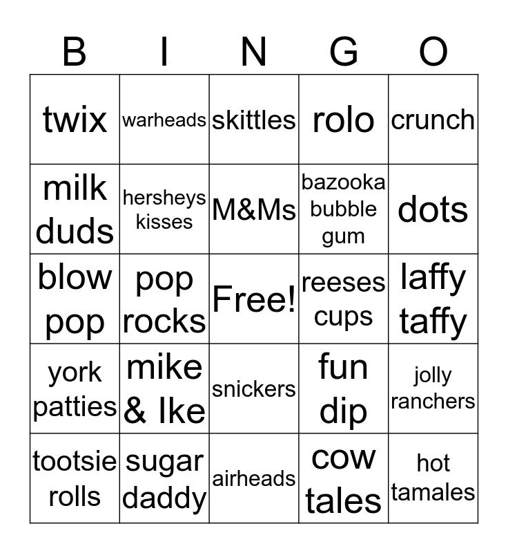 This bingo card has a free space and 24 words: mike & Ike, sugar daddy, M&Ms, tootsie rolls, crunch, twix, milk duds, warheads, reeses cups, snickers, bazooka bubble gum, blow pop, fun dip, jolly ranchers, hersheys kisses, cow tales, laffy taffy, skittles, dots, pop rocks, hot tamales, york patties, rolo and airheads.
