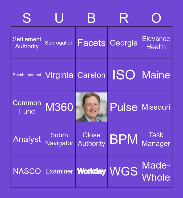 This bingo card has a free space and 24 words: Subro Navigator, Examiner, Carelon, NASCO, Elevance Health, Settlement Authority, Reimbursement, Subrogation, Pulse, Close Authority, ISO, Common Fund, BPM, Task Manager, Virginia, WGS, Missouri, Facets, Maine, M360, Made-Whole, Analyst, Georgia and Workday.