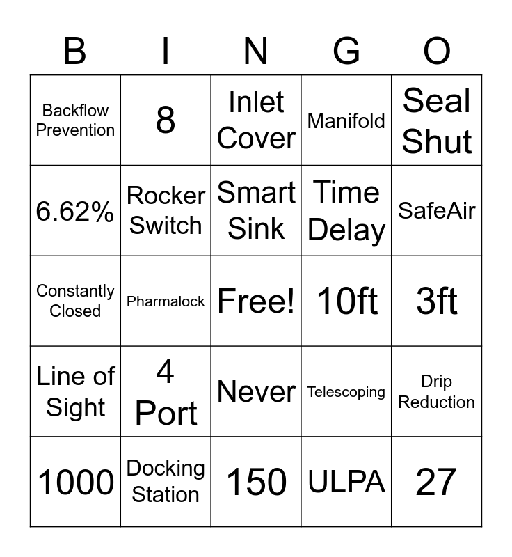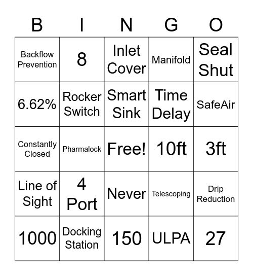 This bingo card has a free space and 24 words: 4 Port, Docking Station, Smart Sink, 1000, Seal Shut, Backflow Prevention, 6.62%, 8, 10ft, Never, Time Delay, Constantly Closed, Telescoping, Drip Reduction, Rocker Switch, ULPA, 3ft, Inlet Cover, SafeAir, Pharmalock, 27, Line of Sight, Manifold and 150.