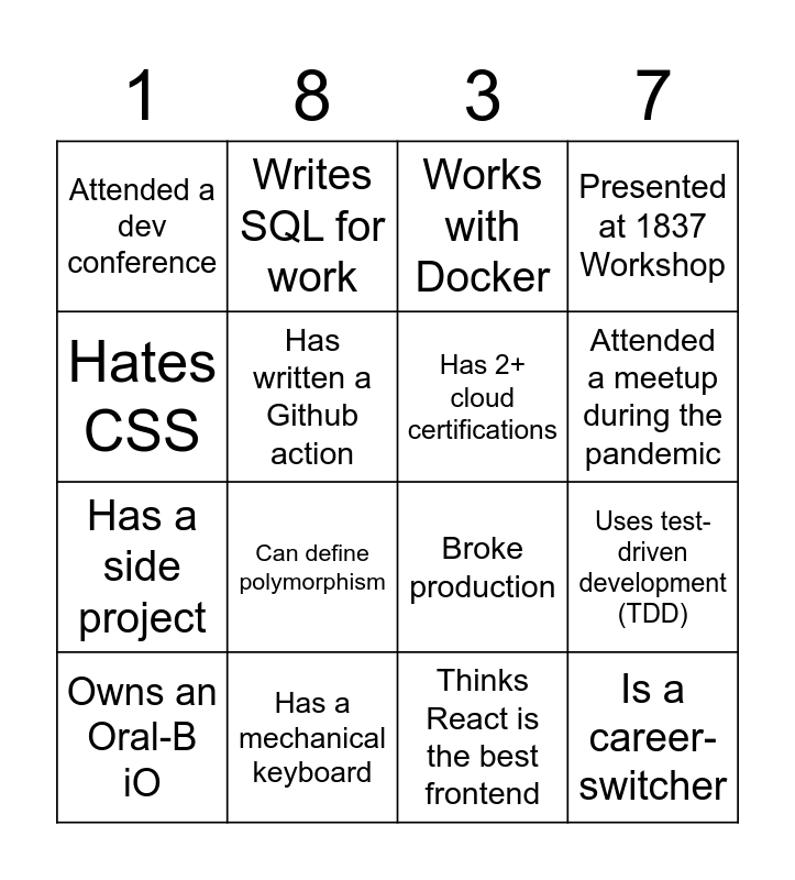 This bingo card has 16 words: Has a mechanical keyboard, Uses test-driven development (TDD), Works with Docker, Attended a dev conference, Has a side project, Writes SQL for work, Broke production, Thinks React is the best frontend, Hates CSS, Has written a Github action, Owns an Oral-B iO, Presented at 1837 Workshop, Can define polymorphism, Attended a meetup during the pandemic, Has 2+ cloud certifications and Is a career-switcher.