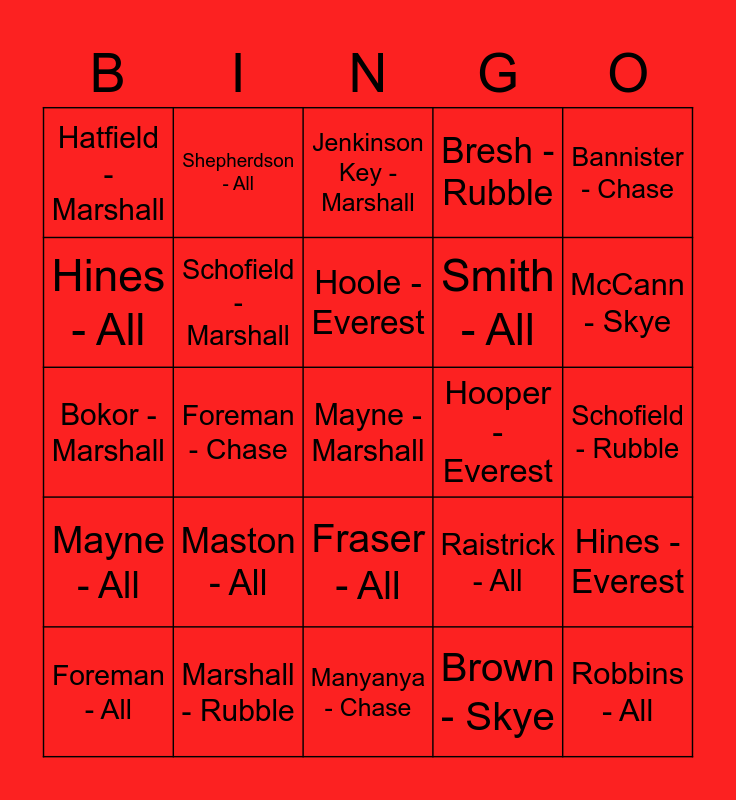 This bingo card has 337 words: Brown - Chase, Crompton - Chase, Slingo - Chase, Heys - Chase, Hoole - Chase, Maben-Mead - Chase, Shepherdson - Chase, Tasker - Chase, Raistrick - Chase, Bresh - Chase, Jones - Chase, Walker - Chase, Free!, Tyrell - Chase, Jenkinson Key - Chase, Hines - Chase, Smith - Chase, Deen - Chase, Hatfield - Chase, Brander - Chase, Maston - Chase, Warden - Chase, Robbins - Chase, Gee - Chase, Moore - Chase, Key - Chase, Crook - Chase, Manyanya - Chase, Kay - Chase, Parkin - Chase, Hartley - Chase, Anderson - Chase, Preston - Chase, Haygarth - Chase, Schofield - Chase, Bannister - Chase, Kitching - Chase, Griffin - Chase, Basar - Chase, Bokor - Chase, Green - Chase, Taylor - Chase, Hooper - Chase, Fraser - Chase, McCann - Chase, Centikaya - Chase, Foreman - Chase, Marshall - Chase, Mayne - Chase, Brown - Skye, Crompton - Skye, Slingo - Skye, Heys - Skye, Hoole - Skye, Maben-Mead - Skye, Shepherdson - Skye, Tasker - Skye, Raistrick - Skye, Bresh - Skye, Jones - Skye, Walker - Skye, Tyrell - Skye, Jenkinson Key - Skye, Hines - Skye, Smith - Skye, Deen - Skye, Hatfield - Skye, Brander - Skye, Maston - Skye, Warden - Skye, Robbins - Skye, Gee - Skye, Moore - Skye, Key - Skye, Crook - Skye, Manyanya - Skye, Kay - Skye, Parkin - Skye, Hartley - Skye, Anderson - Skye, Preston - Skye, Haygarth - Skye, Schofield - Skye, Bannister - Skye, Kitching - Skye, Griffin - Skye, Basar - Skye, Bokor - Skye, Green - Skye, Taylor - Skye, Hooper - Skye, Fraser - Skye, McCann - Skye, Centikaya - Skye, Foreman - Skye, Marshall - Skye, Mayne - Skye, Brown - Marshall, Crompton - Marshall, Slingo - Marshall, Heys - Marshall, Hoole - Marshall, Maben-Mead - Marshall, Shepherdson - Marshall, Tasker - Marshall, Raistrick - Marshall, Bresh - Marshall, Jones - Marshall, Walker - Marshall, Tyrell - Marshall, Jenkinson Key - Marshall, Hines - Marshall, Smith - Marshall, Deen - Marshall, Hatfield - Marshall, Brander - Marshall, Maston - Marshall, Warden - Marshall, Robbins - Marshall, Gee - Marshall, Moore - Marshall, Key - Marshall, Crook - Marshall, Manyanya - Marshall, Kay - Marshall, Parkin - Marshall, Hartley - Marshall, Anderson - Marshall, Preston - Marshall, Haygarth - Marshall, Schofield - Marshall, Bannister - Marshall, Kitching - Marshall, Griffin - Marshall, Basar - Marshall, Bokor - Marshall, Green - Marshall, Taylor - Marshall, Hooper - Marshall, Fraser - Marshall, McCann - Marshall, Centikaya - Marshall, Foreman - Marshall, Marshall - Marshall, Mayne - Marshall, Brown - Rubble, Crompton - Rubble, Slingo - Rubble, Heys - Rubble, Hoole - Rubble, Maben-Mead - Rubble, Shepherdson - Rubble, Tasker - Rubble, Raistrick - Rubble, Bresh - Rubble, Jones - Rubble, Walker - Rubble, Tyrell - Rubble, Jenkinson Key - Rubble, Hines - Rubble, Smith - Rubble, Deen - Rubble, Hatfield - Rubble, Brander - Rubble, Maston - Rubble, Warden - Rubble, Robbins - Rubble, Gee - Rubble, Moore - Rubble, Key - Rubble, Crook - Rubble, Manyanya - Rubble, Kay - Rubble, Parkin - Rubble, Hartley - Rubble, Anderson - Rubble, Preston - Rubble, Haygarth - Rubble, Schofield - Rubble, Bannister - Rubble, Kitching - Rubble, Griffin - Rubble, Basar - Rubble, Bokor - Rubble, Green - Rubble, Taylor - Rubble, Hooper - Rubble, Fraser - Rubble, McCann - Rubble, Centikaya - Rubble, Foreman - Rubble, Marshall - Rubble, Mayne - Rubble, Brown - Everest, Crompton - Everest, Slingo - Everest, Heys - Everest, Hoole - Everest, Maben-Mead - Everest, Shepherdson - Everest, Tasker - Everest, Raistrick - Everest, Bresh - Everest, Jones - Everest, Walker - Everest, Tyrell - Everest, Jenkinson Key - Everest, Hines - Everest, Smith - Everest, Deen - Everest, Hatfield - Everest, Brander - Everest, Maston - Everest, Warden - Everest, Robbins - Everest, Gee - Everest, Moore - Everest, Key - Everest, Crook - Everest, Manyanya - Everest, Kay - Everest, Parkin - Everest, Hartley - Everest, Anderson - Everest, Preston - Everest, Haygarth - Everest, Schofield - Everest, Bannister - Everest, Kitching - Everest, Griffin - Everest, Basar - Everest, Bokor - Everest, Green - Everest, Taylor - Everest, Hooper - Everest, Fraser - Everest, McCann - Everest, Centikaya - Everest, Foreman - Everest, Marshall - Everest, Mayne - Everest, Brown - All, Crompton - All, Slingo - All, Heys - All, Hoole - All, Maben-Mead - All, Shepherdson - All, Tasker - All, Raistrick - All, Bresh - All, Jones - All, Walker - All, Tyrell - All, Jenkinson Key - All, Hines - All, Smith - All, Deen - All, Hatfield - All, Brander - All, Maston - All, Warden - All, Robbins - All, Gee - All, Moore - All, Key - All, Crook - All, Manyanya - All, Kay - All, Parkin - All, Hartley - All, Anderson - All, Preston - All, Haygarth - All, Schofield - All, Bannister - All, Kitching - All, Griffin - All, Basar - All, Bokor - All, Green - All, Taylor - All, Hooper - All, Fraser - All, McCann - All, Centikaya - All, Foreman - All, Marshall - All, Mayne - All, Brown - All, Crompton - All, Slingo - All, Heys - All, Hoole - All, Maben-Mead - All, Shepherdson - All, Tasker - All, Raistrick - All, Bresh - All, Jones - All, Walker - All, Tyrell - All, Jenkinson Key - All, Hines - All, Smith - All, Deen - All, Hatfield - All, Brander - All, Maston - All, Warden - All, Robbins - All, Gee - All, Moore - All, Key - All, Crook - All, Manyanya - All, Kay - All, Parkin - All, Hartley - All, Anderson - All, Preston - All, Haygarth - All, Schofield - All, Bannister - All, Kitching - All, Griffin - All, Basar - All, Bokor - All, Green - All, Taylor - All, Hooper - All, Fraser - All, McCann - All, Centikaya - All, Foreman - All, Marshall - All and Mayne - All.