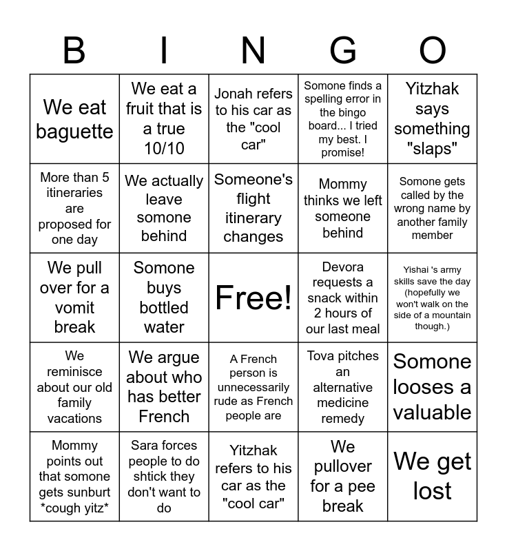 This bingo card has a free space and 24 words: We argue about who has better French, Sara forces people to do shtick they don't want to do, Someone's flight itinerary changes, Mommy points out that somone gets sunburt *cough yitz*, Yitzhak says something "slaps", We eat baguette, More than 5 itineraries are proposed for one day, We eat a fruit that is a true 10/10, Devora requests a snack within 2 hours of our last meal, A French person is unnecessarily rude as French people are, Mommy thinks we left someone behind, We pull over for a vomit break, Tova pitches an alternative medicine remedy, Somone looses a valuable, We actually leave somone behind, We pullover for a pee break, Yishai 's army skills save the day (hopefully we won't walk on the side of a mountain though.), Jonah refers to his car as the "cool car", Somone gets called by the wrong name by another family member, Somone buys bottled water, We get lost, We reminisce about our old family vacations, Somone finds a spelling error in the bingo board... I tried my best. I promise! and Yitzhak refers to his car as the "cool car".