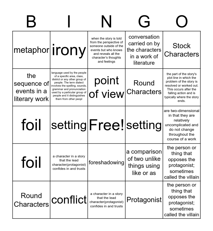 This bingo card has a free space and 24 words: a character in a story that the lead character(protagonist) confides in and trusts, conflict, point of view, Round Characters, Stock Characters, metaphor, the sequence of events in a literary work, irony, setting, foreshadowing, Round Characters, foil, a comparison of two unlike things using like or as, the person or thing that opposes the protagonist; sometimes called the villain, language used by the people of a specific area, class, district or any other group of people. The term dialect involves the spelling, sounds, grammar and pronunciation used by a particular group of people and it distinguishes them from other peopl, Protagonist, are two-dimensional in that they are relatively uncomplicated and do not change throughout the course of a work, when the story is told from the perspective of someone outside of the events but who knows and reveals all the character’s thoughts and feelings, the part of the story's plot line in which the problem of the story is resolved or worked out. This occurs after the falling action and is typically where the story ends., setting, the person or thing that opposes the protagonist; sometimes called the villain, foil, conversation carried on by the characters in a work of literature and a character in a story that the lead character(protagonist) confides in and trusts.