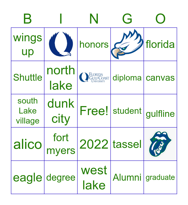 This bingo card has 5 images, a free space and 24 words: eagle, major, dunk city, library, wings up, honors, north lake, fort myers, student, degree, gulfline, graduate, west lake, Alumni, canvas, dirty birds, 2022, alico, florida, south Lake village, tassel, gown, diploma and Shuttle.