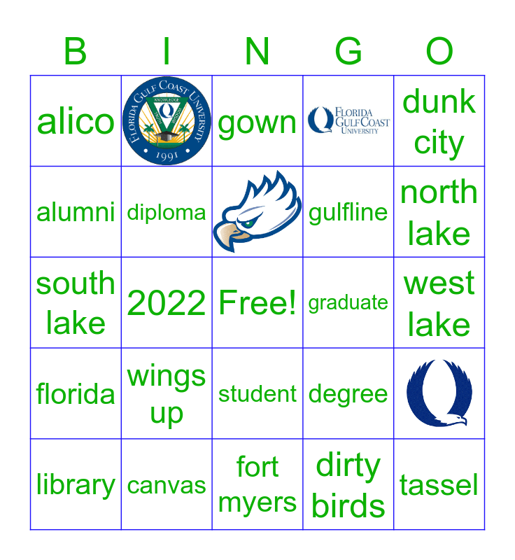 This bingo card has 5 images, a free space and 24 words: library, eagle, 2022, shuttle, alico, gown, diploma, wings up, graduate, canvas, west lake, tassel, fort myers, dirty birds, north lake, honors, student, florida, dunk city, south lake, degree, major, gulfline and alumni.