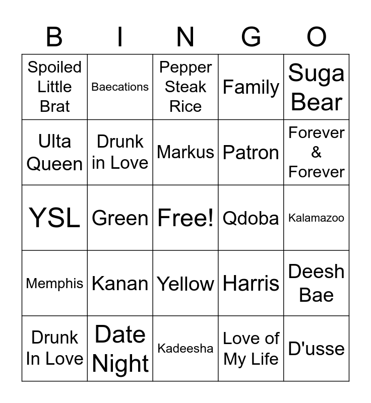 This bingo card has a free space and 25 words: Kanan, Kadeesha, Markus, Drunk In Love, Suga Bear, Spoiled Little Brat, Ulta Queen, Baecations, Qdoba, Yellow, Patron, YSL, Harris, Deesh Bae, Drunk in Love, Nerf Gun Wars, Kalamazoo, Pepper Steak Rice, Forever & Forever, Green, D'usse, Date Night, Memphis, Family and Love of My Life.