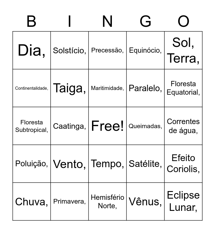 This bingo card has a free space and 74 words: Rotação,, Translação,, Precessão,, Altitude,, Longitude,, Temperatura,, Pressão,, Umidade,, Chuva,, Clima,, Relevo,, Vegetação,, Maritimidade,, Continentalidade,, Cerrado,, Caatinga,, Tundra,, Floresta Equatorial,, Floresta Tropical,, Floresta Subtropical,, Taiga,, Solstício,, Equinócio,, Eclipse Solar,, Eclipse Lunar,, Lua Cheia,, Lua Nova,, Lua Crescente,, Lua Nova,, Lua de Sangue,, Sol, Terra,, Marte,, Júpiter,, Saturno,, Mercúrio,, Vênus,, Urano,, Lua,, Equador,, Hemisfério Sul,, Hemisfério Norte,, Primavera,, Verão,, Outono,, Inverno,, Dia,, Noite,, Vento,, Brisa,, Meteorologia,, Climatologia,, Correntes de ar,, Correntes de água,, Convecção,, Ar quente,, Ar frio,, Tempo,, Brisa marítima,, Topografia,, Efeito Coriolis,, Paralelo,, Aquecimento global,, Poluição,, Desmatamento,, Queimadas,, Lixo,, Superlua,, Lua Azul,, Satélite,, Penumbra,, Sombra,, Constelação de Órion,, Constelação de Escorpião, and Ano.