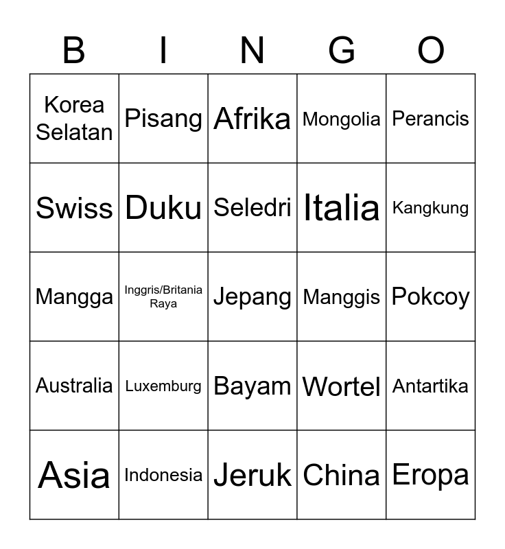 This bingo card has a free space and 24 words: Asia, Luxemburg, Seledri, China, Perancis, Korea Selatan, Pisang, Afrika, Manggis, Pokcoy, Mangga, Duku, Wortel, Antartika, Swiss, Indonesia, Jeruk, Mongolia, Kangkung, Australia, Inggris/Britania Raya, Bayam, Italia and Eropa.