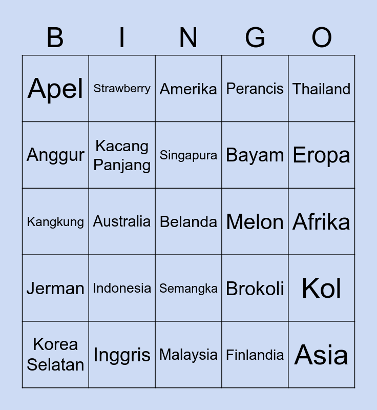 This bingo card has 25 words: Indonesia, Malaysia, Singapura, Korea Selatan, Thailand, Apel, Anggur, Strawberry, Melon, Semangka, Bayam, Kangkung, Brokoli, Kol, Kacang Panjang, Asia, Afrika, Amerika, Eropa, Australia, Belanda, Inggris, Jerman, Perancis and Finlandia.