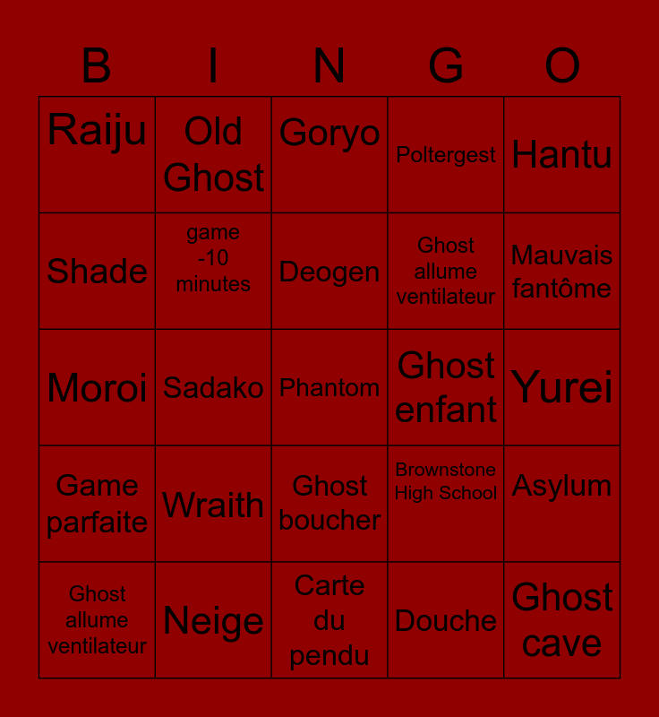 This bingo card has a free space and 81 words: Banshee, Demon, Goryo, Hantu, Jinn, Mare, Myling, Obake, Oni, Onryo, Mimic, Onryo, Poltergest, Raiju, Revenant, Shade, Twins, Wraith, Yokai, Yurei, Deogen, Hantu, Moroi, Deogen, game -10 minutes, Douche, Rocking Chair, Joue guitare, Crane, Cage thoracique, Mauvais fantôme, Ghost photo, Carte du pendu, Rire fantômatique, Ghost allume ventilateur, Ghost enfant, Dessin livre, Explose lumières, Ballon qui bouge, Ghost grenier, Ghost cave, Cercle d'invocation, Crucifix usé à 100%, Empreintes sur fenêtre, Sadako, Garage ghost, Old Ghost, Young Ghost, téléphone qui vibre, Empreintes sur interrupteur, Brownstone High School, Asylum, Maple Lodge Campsite, Prison, Willow Street House, Tanglewood Street House, Ridgeview Road House, Grafton Farmhouse, Edgefield Street House, Bleasdale Farmhouse, Ghost boucher, Ghost rampant, Poupée vaudou, téléphone qui sonne, Boite à musique, Ghost allume TV, Cri de la Banshee, Mort, Ghost à Poil, Carte du pendu, Eau sale, Game parfaite, Neige, Carte high Priest, Alarme voiture, Tarot, Ouija, Douche, Bathroom, Ghost allume ventilateur and Crucifix usé à 100%.