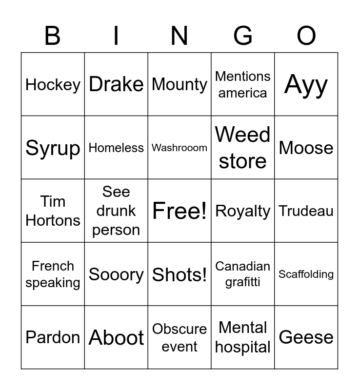 This bingo card has a free space and 24 words: Sooory, Aboot, Washrooom, Pardon, Ayy, Hockey, Syrup, Drake, Royalty, Shots!, Weed store, Tim Hortons, Canadian grafitti, Scaffolding, Homeless, Mental hospital, Trudeau, Mounty, Moose, See drunk person, Geese, French speaking, Mentions america and Obscure event.