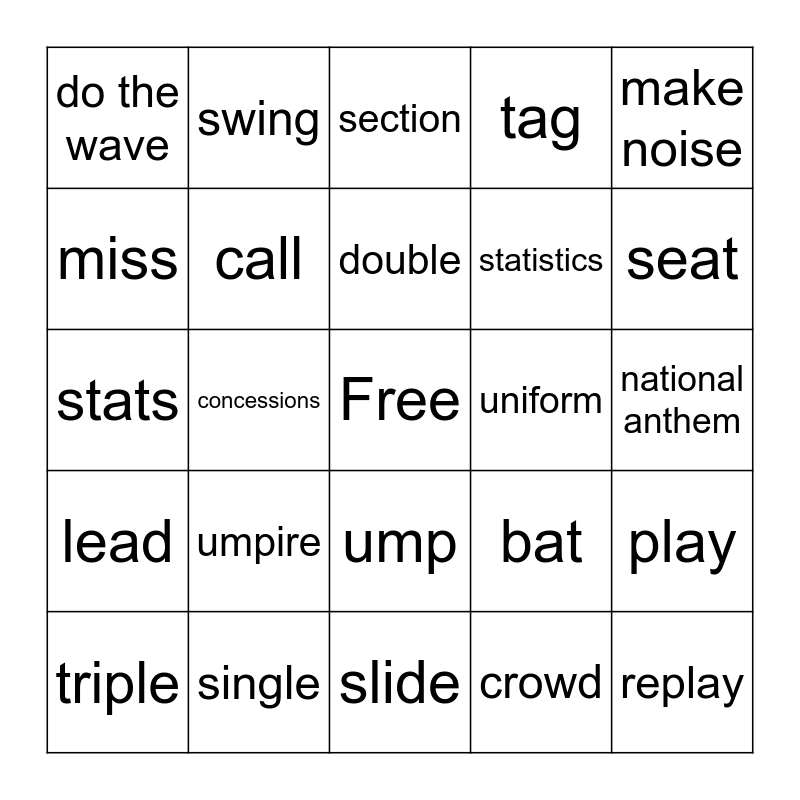 This bingo card has a free space and 24 words: umpire, single, double, triple, make noise, do the wave, miss, swing, uniform, ump, statistics, stats, bat, play, call, crowd, national anthem, section, seat, concessions, replay, lead, tag and slide.