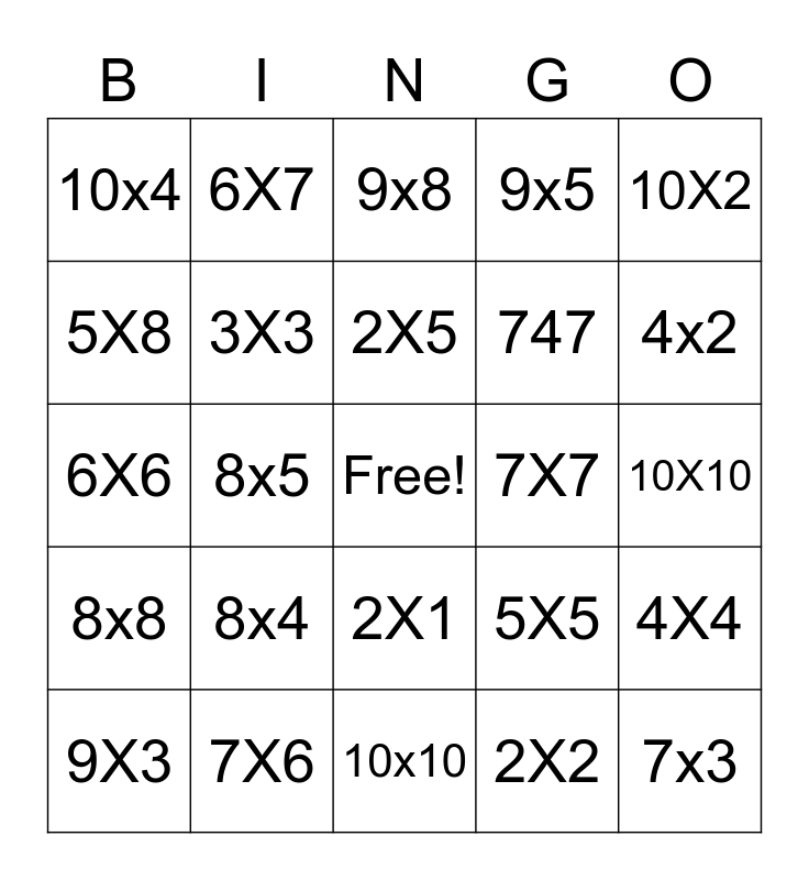 This bingo card has a free space and 24 words: 8x4, 7X6, 2X5, 9X3, 10X2, 10x4, 5X8, 6X7, 7X7, 2X1, 747, 6X6, 5X5, 4X4, 3X3, 2X2, 10X10, 9x8, 4x2, 8x5, 7x3, 8x8, 9x5 and 10x10.