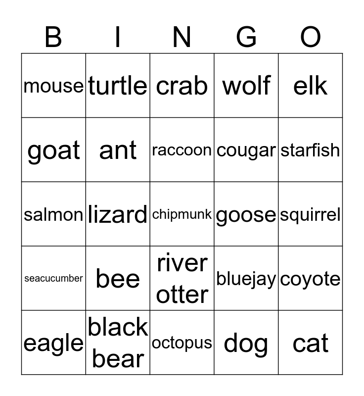 This bingo card has 34 words: cat, dog, hawk, clam, seacucumber, ant, elk, eagle, turtle, sea, raccoon, crab, bug, bobcat, goose, starfish, black bear, salmon, bee, bluejay, river otter, raven, mouse, squirrel, octopus, chipmunk, wolf, beaver, cougar, goat, butterfly, lizard, coyote and grizzley bear.