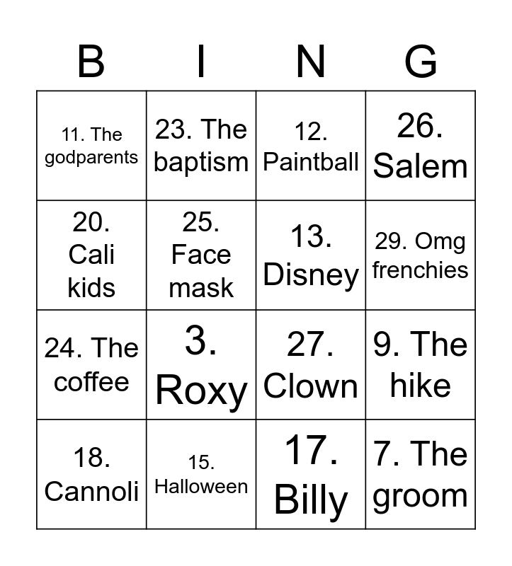 This bingo card has 31 words: Free!, 8. The bride, 9. The hike, 10. The lobster, 11. The godparents, 12. Paintball, 13. Disney, 14. The ring, 15. Halloween, 16. The kiss, 17. Billy, 18. Cannoli, 1. Camila, 2. Fiji, 3. Roxy, 4. Chews, 5. Momo, 6. Lil baby, 7. The groom, 19. The Graduate, 20. Cali kids, 21. Titanic, 22. Texans, 23. The baptism, 24. The coffee, 25. Face mask, 26. Salem, 27. Clown, 28. Firefighter, 29. Omg frenchies and 30. Cheetah.