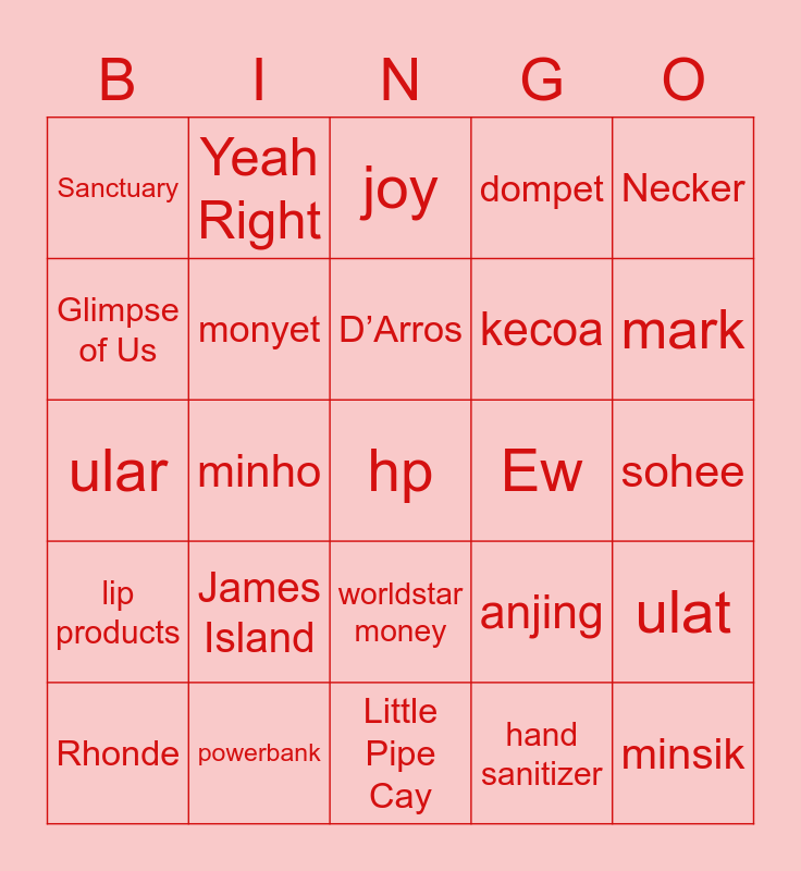 This bingo card has 25 words: James Island, Little Pipe Cay, D’Arros, Rhonde, Necker, Sanctuary, Glimpse of Us, Yeah Right, Ew, worldstar money, kecoa, ular, anjing, ulat, monyet, minsik, sohee, joy, mark, minho, hp, powerbank, lip products, dompet and hand sanitizer.