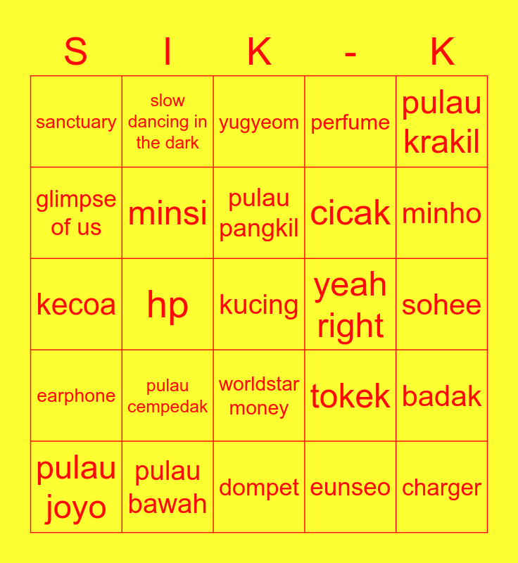 This bingo card has a free space and 24 words: pulau cempedak, pulau bawah, pulau pangkil, pulau joyo, pulau krakil, sanctuary, glimpse of us, slow dancing in the dark, yeah right, worldstar money, cicak, kecoa, tokek, badak, minsi, eunseo, sohee, yugyeom, minho, hp, charger, earphone, perfume and dompet.