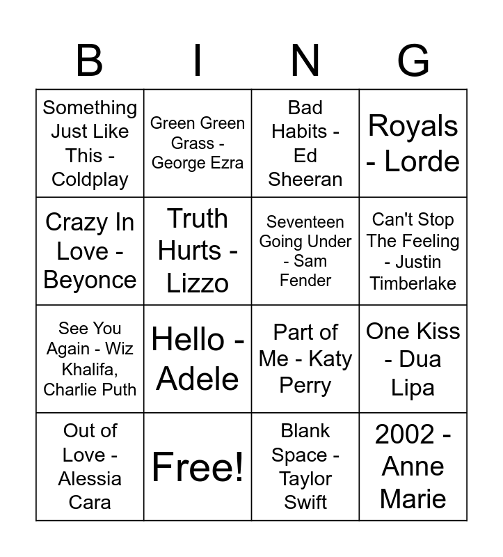 This bingo card has 21 words: Free!, As It Was - Harry Styles, Green Green Grass - George Ezra, Black Magic - Little Mix, Blank Space - Taylor Swift, Seventeen Going Under - Sam Fender, Something Just Like This - Coldplay, Bad Habits - Ed Sheeran, Part of Me - Katy Perry, Can't Stop The Feeling - Justin Timberlake, See You Again - Wiz Khalifa, Charlie Puth, Royals - Lorde, 2002 - Anne Marie, Came Here for Love - Sigala, Ella Eyre, Truth Hurts - Lizzo, Thank You Next - Ariana Grande, Out of Love - Alessia Cara, Hello - Adele, Crazy In Love - Beyonce, One Kiss - Dua Lipa and Love Me Like You Do - Ellie Goulding.
