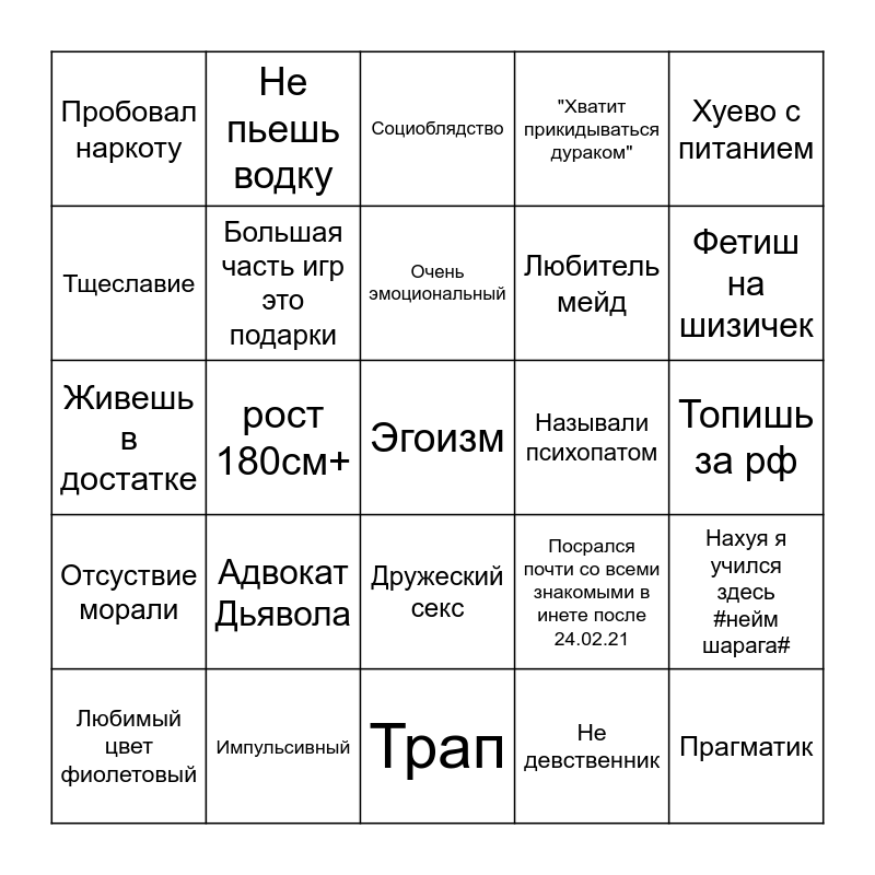 This bingo card has a free space and 24 words: Адвокат Дьявола, Импульсивный, Очень эмоциональный, Любимый цвет фиолетовый, Хуево с питанием, Пробовал наркоту, Тщеславие, Не пьешь водку, Называли психопатом, Дружеский секс, Любитель мейд, Живешь в достатке, Посрался почти со всеми знакомыми в инете после 24.02.21, Нахуя я учился здесь #нейм шарага#, Большая часть игр это подарки, Не девственник, Топишь за рф, Социоблядство, Фетиш на шизичек, рост 180см+, Прагматик, Отсуствие морали, "Хватит прикидываться дураком" and Трап.