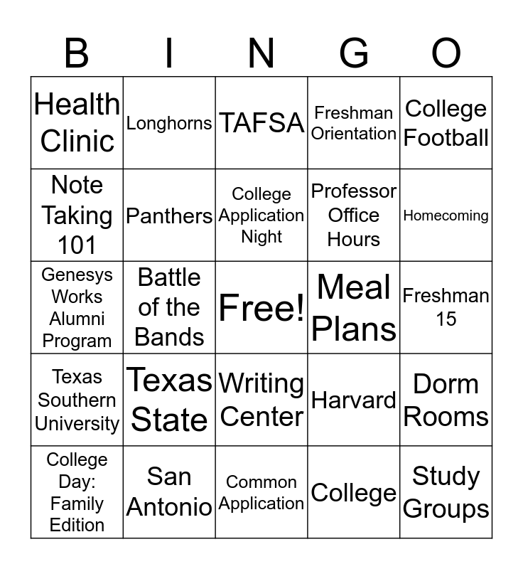 This bingo card has a free space and 24 words: Texas State, San Antonio, College Application Night, College Day: Family Edition, College Football, Health Clinic, Note Taking 101, Longhorns, Meal Plans, Writing Center, Professor Office Hours, Genesys Works Alumni Program, Harvard, Dorm Rooms, Panthers, College, Freshman 15, TAFSA, Homecoming, Battle of the Bands, Study Groups, Texas Southern University, Freshman Orientation and Common Application.