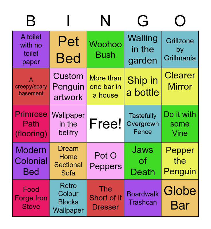 This bingo card has a free space and 24 words: Dream Home Sectional Sofa, Retro Colour Blocks Wallpaper, More than one bar in a house, Food Forge Iron Stove, Grillzone by Grillmania, A toilet with no toilet paper, A creepy/scary basement, Pet Bed, Tastefully Overgrown Fence, Pot O Peppers, Ship in a bottle, Primrose Path (flooring), Jaws of Death, Pepper the Penguin, Custom Penguin artwork, Boardwalk Trashcan, Do it with some Vine, Woohoo Bush, Clearer Mirror, Wallpaper in the bellfry, Globe Bar, Modern Colonial Bed, Walling in the garden and The Short of it Dresser.