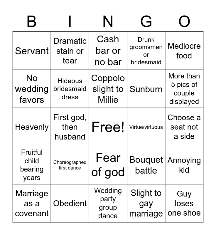 This bingo card has a free space and 24 words: Choreographed first dance, Obedient, Coppolo slight to Millie, Marriage as a covenant, Mediocre food, Servant, No wedding favors, Dramatic stain or tear, Virtue/virtuous, Fear of god, Sunburn, Heavenly, Bouquet battle, Annoying kid, Hideous bridesmaid dress, Slight to gay marriage, Choose a seat not a side, Cash bar or no bar, More than 5 pics of couple displayed, First god, then husband, Guy loses one shoe, Fruitful child bearing years, Drunk groomsmen or bridesmaid and Wedding party group dance.