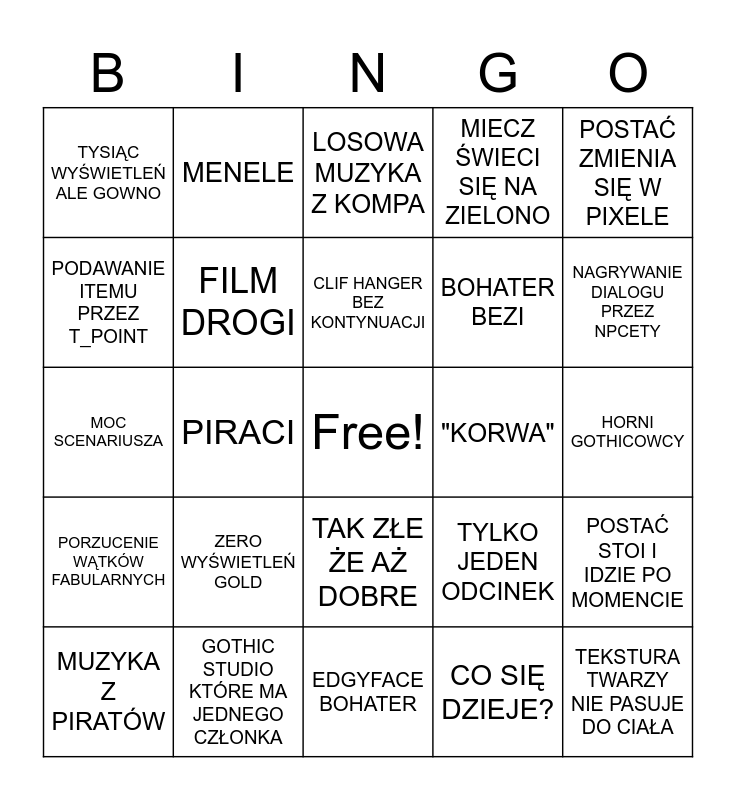 This bingo card has a free space and 94 words: KTOŚ TAŃCZY Z FIREVICTIM, WIEDŹMIN, EDGYFACE BOHATER, BITWA PLADYNÓW Z ORKAMI, WYBRANIEC BOGÓW, ZAMORDOWANIE FARMY, MUZYKA Z FABLE, MUZYKA Z PIRATÓW, WRZÓD, PRZESTARZAŁY REFERENCE, BEZI I XARDAS, IVONA ZASTĘPUJE DUBBING, MOOORAS, BOHATER BEZI, HIGH QUALITY DUBBING, POSTAĆ ZMIENIA SIĘ W PIXELE, LOSOWA MUZYKA Z KOMPA, ANUBIS DUBUJE ŁYSEGO, EDŻY GŁÓWNY BOHATER, ARG W TLE, SUPER MODDING, POSTAĆ MÓWI Z ZAMKNIĘTYMI OCZAMI, GOTHIC TRAILER, DEMO IVONA, ZERO WYŚWIETLEŃ GOLD, FILM DROGI, ZABIJANIE LOSOWYCH MOBÓW, NIE POTRZEBNE PRZEKLINANIE, FABULARNE WYJAŚNIENIA LOSOWYCH BŁĘDÓW, ŁAMANIE CZWARTEJ ŚCIANY, GOTHIC STUDIO KTÓRE MA JEDNEGO CZŁONKA, TAK ZŁE ŻE AŻ DOBRE, RESIDENT SLEEPER, CAMEO ZDUPY, MENELE, KLOZETOWY HUMOR, RECYKLING UJĘĆ, ŁAMANIE OSI, CLIF HANGER BEZ KONTYNUACJI, TYLKO JEDEN ODCINEK, MOC SCENARIUSZA, PORZUCENIE WĄTKÓW FABULARNYCH, HORNI GOTHICOWCY, BARDZO KIEPSKIE EFEKTY SPECJALNE, TEKSTURA TWARZY NIE PASUJE DO CIAŁA, GOTHIC ANIME, SEBA GOTHIC, NIE WYRAŹNY DUBBING, RIP MASTERING, 12 LAT DUBBING, GOTHIC DISCO, CO SIĘ DZIEJE?, ZJEBANY KONTRAST, KHORINIS, NIE KHORINIS, GOTHIC TEKSTUR PACKI, GOTHIC AUTORSKIE RESKINY, ESKALACJA KONFLIKTU, LOSOWY KLIP Z CZEGOŚ INNEGO, TEKST Z ŻYWCEM Z GOTHICA, PIRACI, GILDIE Z GOTHIC 3, NAZWA Z GENERATORA, ZÓMER, KONIEC ŚWIATA OST/REQUIEM, PLAN ZŁOCZYŃCY NIE ROBI SENSU, GEJOWE DIALOGI, PODAWANIE ITEMU PRZEZ RZUCANIE NA ZIEMIE, PODAWANIE ITEMU PRZEZ T_POINT, T_PLUNDER, SIKANIE FUNY, NAWIĄZANIE DO STAR WARS, MIESZANIE PRAWDZIWEGO ŚWIATA Z GOTHICIEM, WŁASNA DREWNO ANIMACJA, MIECZ ŚWIECI SIĘ NA ZIELONO, ŻÓŁTE NIEBO, BRAK TOGGLE DESKTOP, NAGRYWANIE DIALOGU PRZEZ NPCETY, POSTAĆ STOI I IDZIE PO MOMENCIE, DAMAGE TYPE 16, GIWANIE GŁOWĄ ZAMIAST MÓWIENIA, FILM WYGLĄDA NA 2008 A NIE JEST, FRAPS /BANDICAM DEMO, "KORWA", TYSIĄC WYŚWIETLEŃ ALE GOWNO, moment kosmity, KEVIN MCLEOD, INTRO DŁUŻSZE NIŻ FILM, FILM PRZYSTANI JACKA, VURT, L'HIVIER, MROCZNE TAJEMNICE, PRZESTER and SĘDZIA AMADEUSZ.