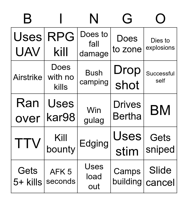 This bingo card has a free space and 24 words: Kill bounty, AFK 5 seconds, Bush camping, Gets 5+ kills, Dies to explosions, Uses UAV, Airstrike, RPG kill, Drives Bertha, Edging, Drop shot, Ran over, Uses stim, Gets sniped, Does with no kills, Camps building, BM, Does to fall damage, Successful self, Uses kar98, Slide cancel, TTV, Does to zone and Uses load out.