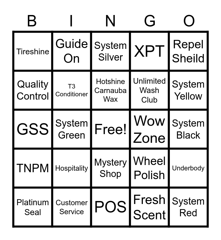This bingo card has a free space and 24 words: Hospitality, Customer Service, Hotshine Carnauba Wax, Platinum Seal, Repel Sheild, Tireshine, Quality Control, Guide On, Wow Zone, Mystery Shop, Unlimited Wash Club, GSS, Wheel Polish, Underbody, T3 Conditioner, Fresh Scent, System Black, System Silver, System Yellow, System Green, System Red, TNPM, XPT and POS.