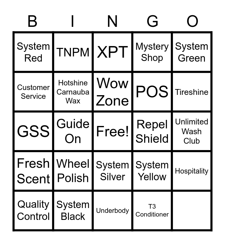 This bingo card has a free space and 24 words: Fresh Scent, System Black, System Silver, System Yellow, System Green, System Red, TNPM, XPT, POS, Hospitality, Customer Service, Hotshine Carnauba Wax, Platinum Seal, Repel Shield, Tireshine, Quality Control, Guide On, Wow Zone, Mystery Shop, Unlimited Wash Club, GSS, Wheel Polish, Underbody and T3 Conditioner.