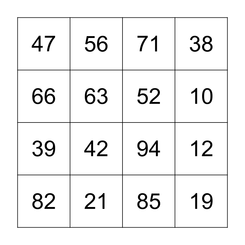 This bingo card has a free space and 15 words: 82, 19, 71, 47, 10, 66, 42, 85, 63, 39, 12, 38, 52, 56 and 21.