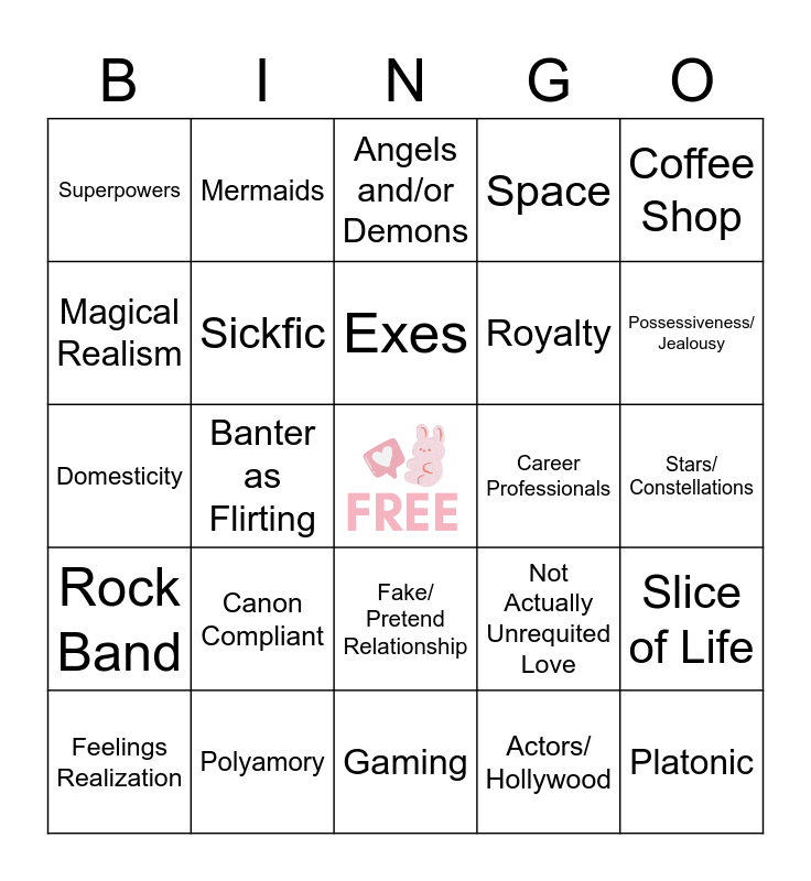 This bingo card has a free space and 24 words: Canon Compliant, Polyamory, Exes, Feelings Realization, Coffee Shop, Superpowers, Magical Realism, Mermaids, Career Professionals, Fake/ Pretend Relationship, Royalty, Domesticity, Not Actually Unrequited Love, Slice of Life, Sickfic, Actors/ Hollywood, Stars/ Constellations, Angels and/or Demons, Possessiveness/ Jealousy, Banter as Flirting, Platonic, Rock Band, Space and Gaming.