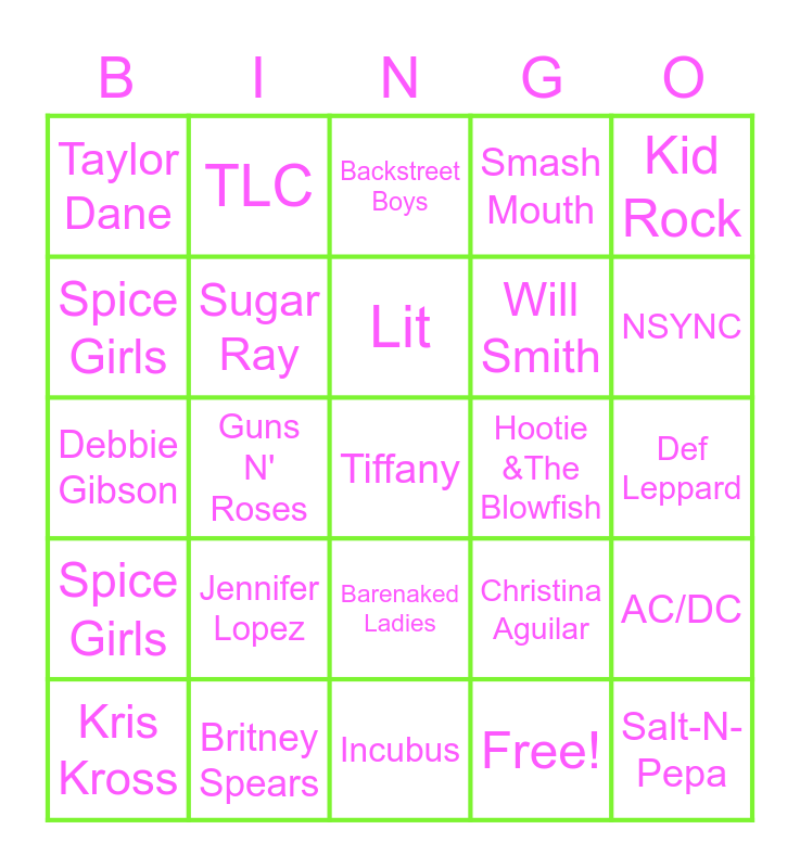 This bingo card has 30 words: Britney Spears, Tom Petty, Guns N' Roses, Vanilla Ice, Taylor Dane, Backstreet Boys, Sugar Ray, Barenaked Ladies, Hootie &The Blowfish, Incubus, Def Leppard, Tiffany, Free!, Salt-N-Pepa, NSYNC, NKOTB, Christina Aguilar, Spice Girls, Jennifer Lopez, Kid Rock, Debbie Gibson, Destiny's Child, TLC, Will Smith, Spice Girls, Smash Mouth, AC/DC, Kris Kross, Lit and Ace of Base.
