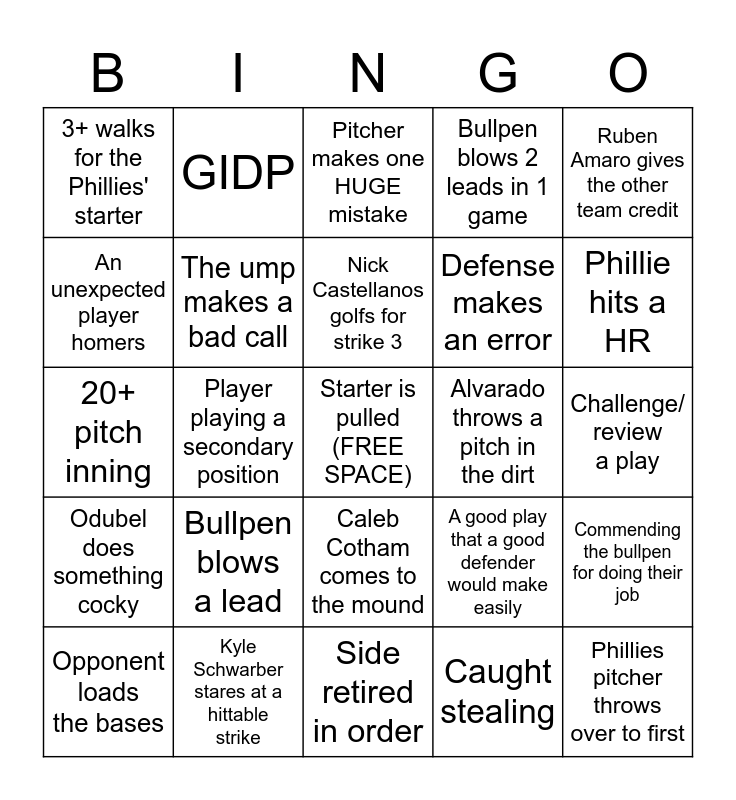 This bingo card has a free space and 24 words: Bullpen blows a lead, Kyle Schwarber stares at a hittable strike, Nick Castellanos golfs for strike 3, Opponent loads the bases, Ruben Amaro gives the other team credit, 3+ walks for the Phillies' starter, An unexpected player homers, GIDP, Alvarado throws a pitch in the dirt, Caleb Cotham comes to the mound, Defense makes an error, 20+ pitch inning, A good play that a good defender would make easily, Commending the bullpen for doing their job, The ump makes a bad call, Caught stealing, Challenge/ review a play, Pitcher makes one HUGE mistake, Phillie hits a HR, Player playing a secondary position, Phillies pitcher throws over to first, Odubel does something cocky, Bullpen blows 2 leads in 1 game and Side retired in order.