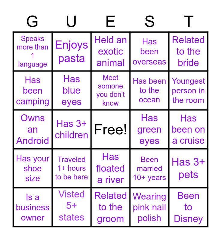 This bingo card has a free space and 29 words: Left Handed, Visted 5+ states, Held an exotic animal, Plays an instrument, Related to the bride, Speaks more than 1 language, Has blue eyes, Meet somone you don't know, Has green eyes, Has 3+ pets, Is a business owner, Has 3+ children, Wearing pink nail polish, Been to Disney, Owns an Android, Owns an Iphone, Related to the groom, Been married 10+ years, Youngest person in the room, Has your shoe size, Traveled 1+ hours to be here, Doesn't like seafood, Has been to the ocean, Has been on a cruise, Has been camping, Enjoys pasta, Has floated a river, Has been overseas and Has riden a horse.