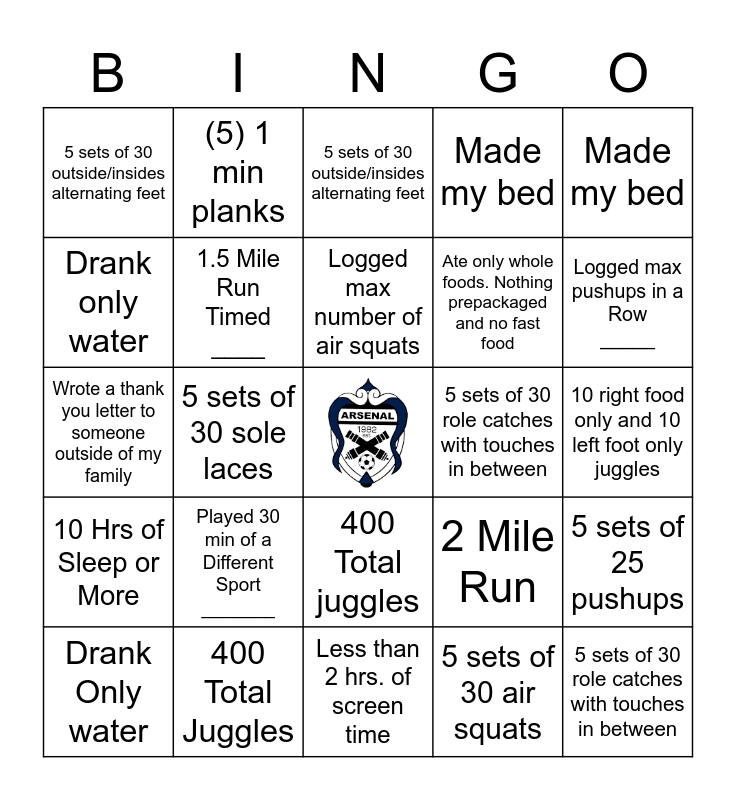 This bingo card has a free space and 24 words: Played 30 min of a Different Sport _______, 400 Total Juggles, Logged max number of air squats, Drank Only water, Made my bed, 5 sets of 30 outside/insides alternating feet, Drank only water, (5) 1 min planks, 5 sets of 30 role catches with touches in between, 400 Total juggles, Ate only whole foods. Nothing prepackaged and no fast food, Wrote a thank you letter to someone outside of my family, 2 Mile Run, 5 sets of 25 pushups, 1.5 Mile Run Timed ____, 5 sets of 30 air squats, 10 right food only and 10 left foot only juggles, 5 sets of 30 outside/insides alternating feet, Logged max pushups in a Row _____, 5 sets of 30 sole laces, 5 sets of 30 role catches with touches in between, 10 Hrs of Sleep or More, Made my bed and Less than 2 hrs. of screen time.
