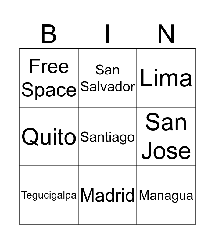 This bingo card has a free space and 8 words: San Jose, Lima, San Salvador, Tegucigalpa, Free Space, Managua, Quito and Madrid.