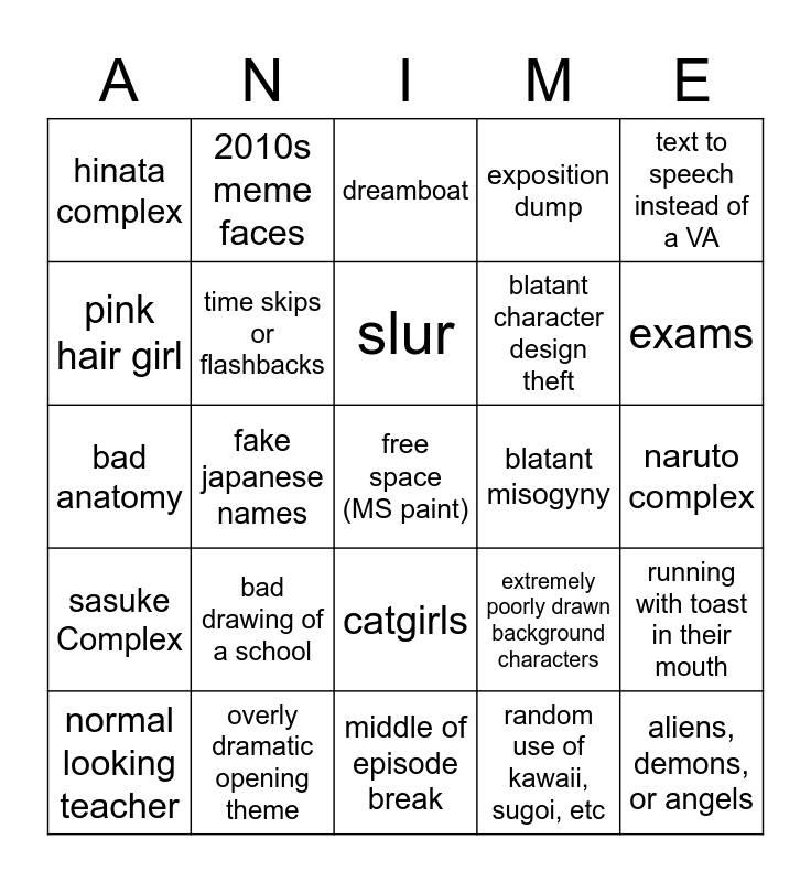 This bingo card has a free space and 40 words: reference to a real anime, bad anatomy, clear self insert, time skips or flashbacks, overly dramatic opening theme, catgirls, slur, silhouettes, text to speech instead of a VA, sasuke Complex, fake japanese names, exposition dump, aliens, demons, or angels, naruto complex, blatant misogyny, bad drawing of a school, extremely emotional closing theme, hinata complex, TITTIES, dreamboat, running with toast in their mouth, random use of kawaii, sugoi, etc, blatant character design theft, pink hair girl, really terrible sound effect, gamer character, anime protagonist seat in classroom, babyvoice girl, "did you just say", obscure geography, class designations (1A, 2B, etc.), normal looking teacher, student council, extremely poorly drawn background characters, exams, middle of episode break, "-chan", "-san", big bro, 2010s meme faces and entire family dies.