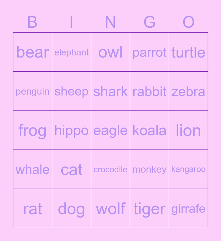 This bingo card has a free space and 24 words: cat, dog, shark, rat, turtle, bear, penguin, elephant, koala, crocodile, rabbit, frog, monkey, kangaroo, sheep, tiger, lion, owl, zebra, hippo, girrafe, whale, parrot and wolf.
